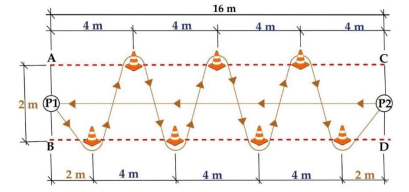 en el opuesto (P2) se coloca una pelota de tenis. Sobre las cruces se colocan los siete conos de señalización, quedando así preparado el circuito.